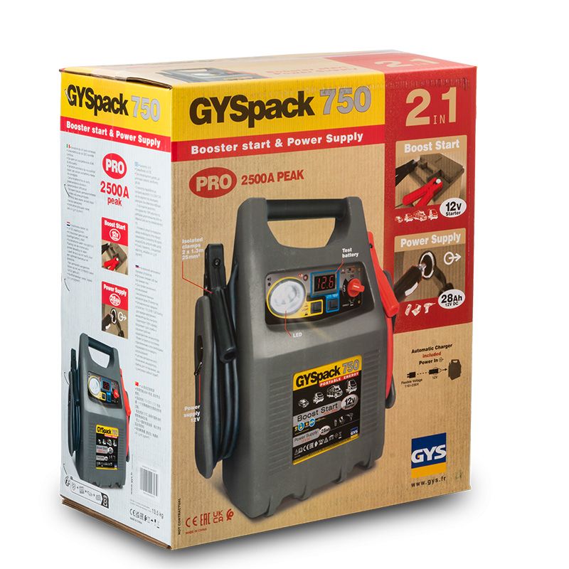 GYSPACK PRO 026179 нь 12 В-ын хар тугалга хүчилтэй аккумулятор бүхий бүх төрлийн тээврийн хэрэгслийг (мотоцикл, автомашин, кемпер, бензин болон дизель хөдөлгүүртэй) асаах зориулалттай төхөөрөмж юм. Дотоод 22 Ah багтаамжтай батерей нь 12 В-ын тогтворжуулсан гаралттай цахилгаан эх үүсвэрийг (TV, гэрэл, зөөврийн компьютер гэх мэт) хангах боломжтой. Оргил 1750 A хүртэлх гүйдэл нь хөдөлгүүрийг шуурхай асаахад шаардлагатай эхэлтийн хүчийг хангадаг. Жин нь 9 кг, хэмжээ нь 34 x 20 x 43 см тул зөөвөрлөхөд хялбар. Мөн туслах гэрэл, поляритетийн хамгаалалт, цэнэгийн төлөвийн заагч зэрэг хэрэглэгчийн аюулгүй байдал, тав тухыг хангах нэмэлт функцүүдтэй.
