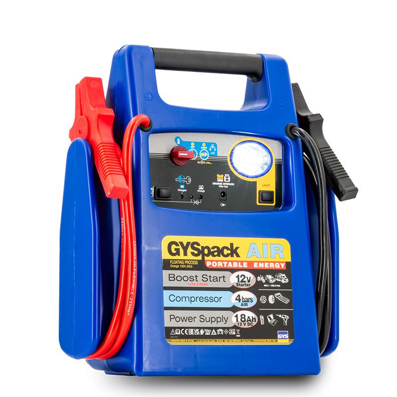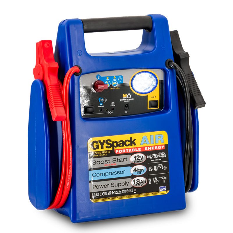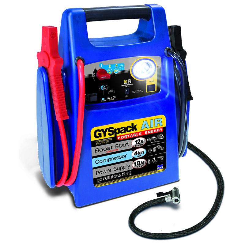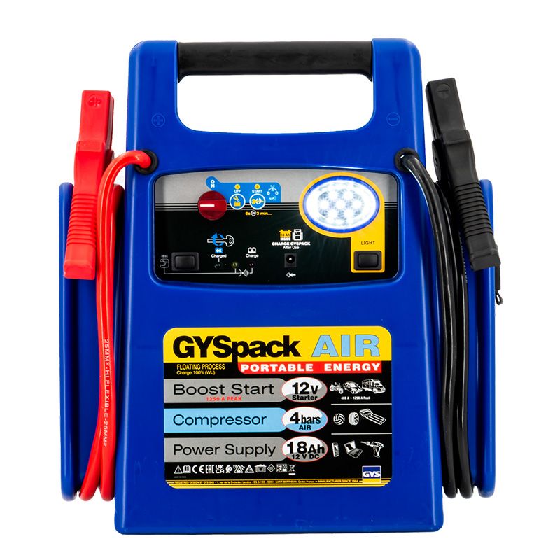GYSPACK AIR 026322 нь 12 В-ын хар тугалга хүчилтэй аккумулятор бүхий бүх төрлийн тээврийн хэрэгслийг (мотоцикл, автомашин, кемпер, бензин болон дизель хөдөлгүүртэй) асаах зориулалттай төхөөрөмж юм. Дотоод 18 Ah багтаамжтай батерей нь 12 В-ын тогтворжуулсан гаралттай цахилгаан эх үүсвэрийг (TV, гэрэл, зөөврийн компьютер гэх мэт) хангах боломжтой. Оргил 1250 A хүртэлх гүйдэл нь хөдөлгүүрийг шуурхай асаахад шаардлагатай эхэлтийн хүчийг хангадаг. Жин нь 10 кг, хэмжээ нь 35.5 x 19.5 x 43 см тул зөөвөрлөхөд хялбар. Мөн туслах гэрэл, поляритетийн хамгаалалт, цэнэгийн төлөвийн заагч зэрэг хэрэглэгчийн аюулгүй байдал, тав тухыг хангах нэмэлт функцүүдтэй.